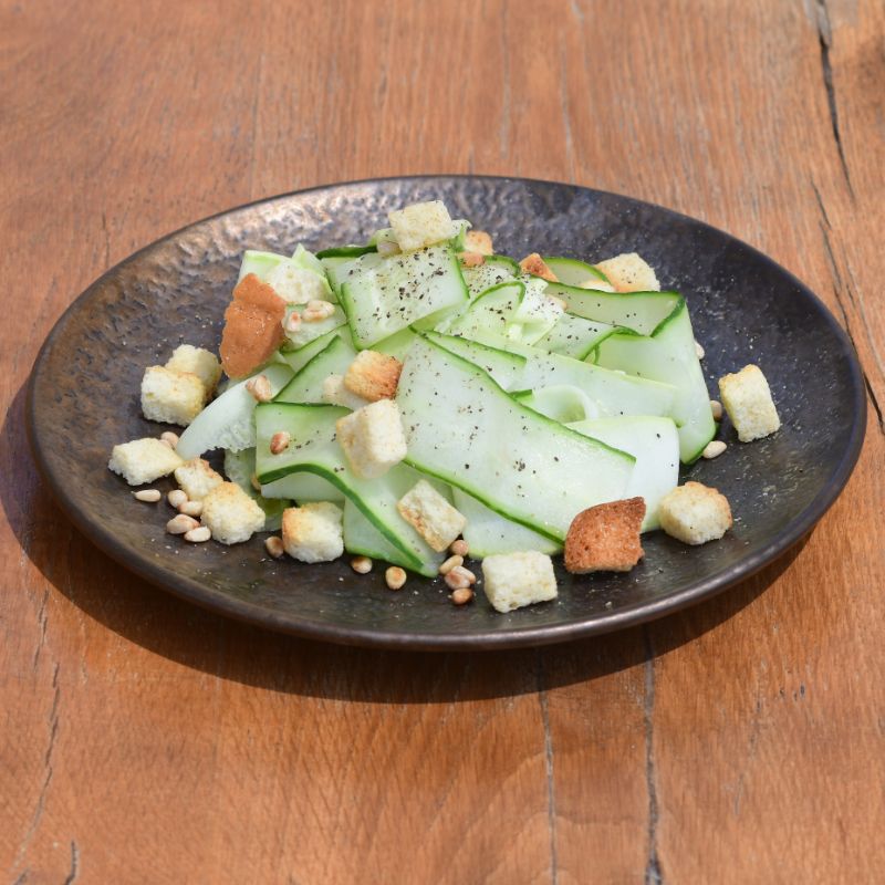ΜΕ ΦΡΕΣΚΟ ΚΟΛΟΚΥΘΑΚΙ, ΑΓΓΟΥΡΙ, ΚΑΤΣΙΚΙΣΙΟ ΤΥΡΙ, ΚΟΥΚΟΥΝΑΡΙ, ΚΡΟΥΤΟΝ, ΔΥΟΣΜΟ ΚΑΙ VINEGRAITTE ΛΕΜΟΝΙΟΥ ( Το κατσικίσιο τυρί αντικαθιστάτε με κρουτόν για μια VEGAN απόλαυση )