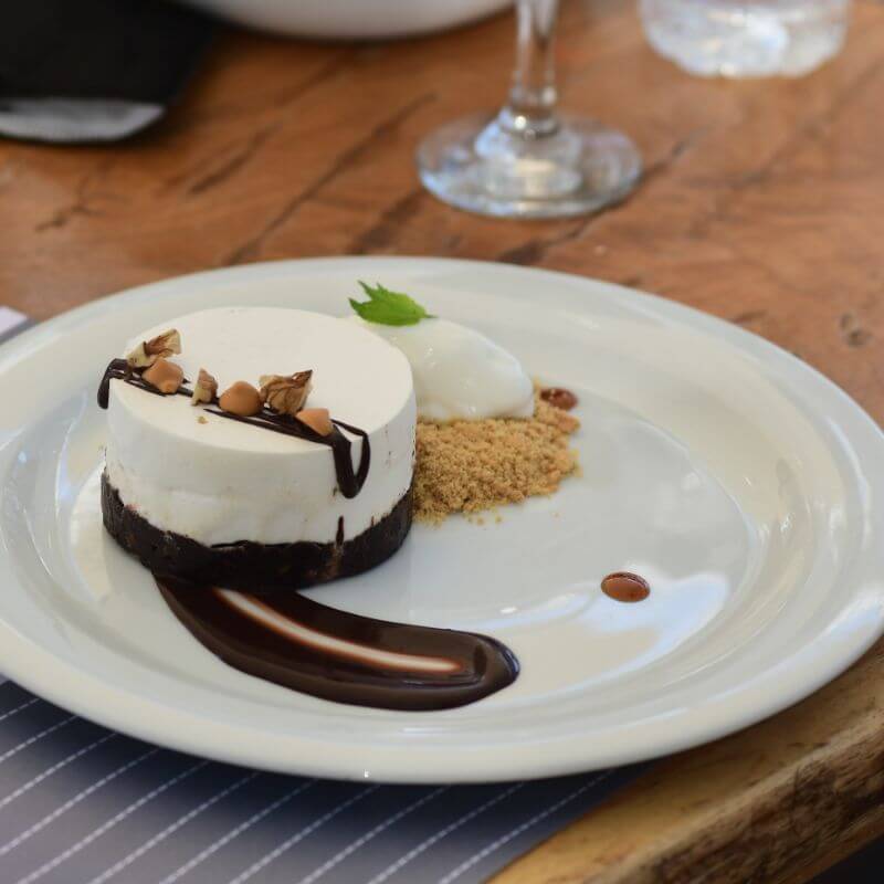 MOSAIC AU CHOCOLAT WITH WALNUTS, CARAMEL CREAM, CHOCOLATE SAUCE AND VANILLA ICE CREAM *Frozen